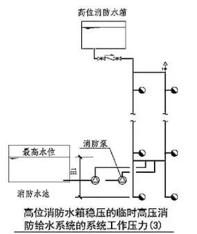 图二、三所示:高位消防水箱稳压的临时高压消防给水系统的系统工作压力是Hmax=H1+H0,H0是水泵零流量时的扬程