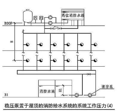 图四所示:为稳压泵置于屋顶的情况,此时系统的工作压力为:Hmax=H1+H0,系统的静压为P2+H