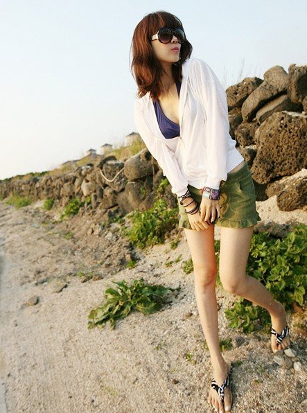时尚点评:沙滩上的比基尼装,为了避免过于暴露,可以配上相应的外套和短裤。半透明的白色外套,有点点小性感。荷叶边的绿色短裤,修饰你的大腿线条。