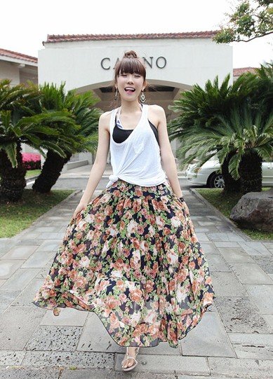 时尚点评:小背心叠穿+大花长裙,没有什么比这套更有民族风情了。配上彩色大耳环和细条凉鞋,女人味尽情散发!