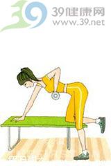 把右手和右膝放在凳子上,左手抓一个中等重量的哑铃,手掌向上,肘部轻轻弯曲。左肘与肩膀同高,收紧小腹,脖子与脊背在一条直线上。放下,回到开始位置,重复做10至15次,换右手做。