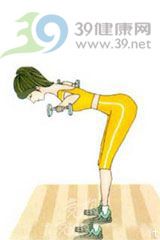 站立,膝盖微屈,双脚分开,与臀同宽,双手各抓一个轻度重量的哑铃,手掌相向。上身前倾与地面平行。收紧小腹,保持背部挺直,慢慢抬高双臂,使之与肩膀同高。收紧肩胛骨。保持一会儿,回到开始的位置,重复做10至15次。