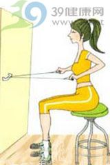 在门把手上拴一条有弹性的带子或软管,双手各执带子的一端,坐好、拉紧,使胳膊与肩膀同高,然后轻轻弯曲肘部,慢慢地往后拉带子,直至肘部与胸部同高,收紧肩胛骨。保持一会儿,回到开始的位置,重复做12至15次。