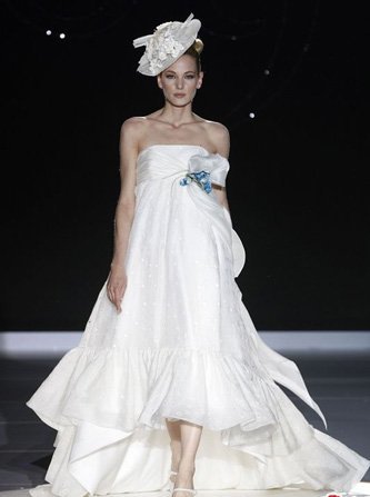 纯白并非婚纱唯一的经典色,象牙白、香槟色、浅金、银灰等彩色面料素来占据着婚纱选料的重要席位。而现在这些经典色系重新回归,一跃成为设计师手中炙手可热的宠儿,在强调设计感的款式和细节处理上,这些面料富有层次的剪裁使婚纱更加耐人寻味,大有抢夺纯白崇高地位的势头。