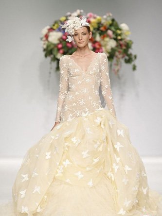 新娘穿着白色婚纱行礼的传统只有200年的历史,在此之前西方婚礼服的颜色也是五花八门,因此本季设计师大量采用彩色面料制作婚纱,与其说是创新,倒不如说是一种回归。而这种五彩缤纷的回归既符合新人举行婚礼时愉悦的心情,又顺应了彩虹色的时尚潮流,可谓一举两得。