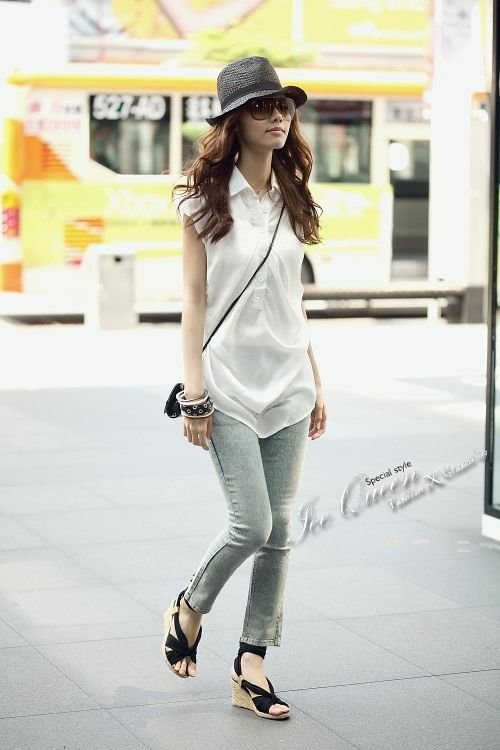 时尚点评:无袖设计的白色衬衣也是展现成熟魅力的单品哦,带点休闲与甜美feel白色衬衣长度盖过了臀部,轻薄透明的质感非常特别,搭配修脚的牛仔裤也很好看!