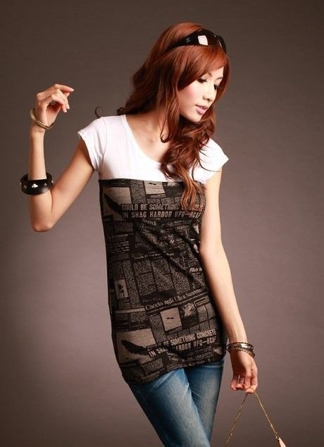 时尚点评:线条感非常棒的长t很容易就能塑造高挑淑女look,抹胸式的拼接上衣能够让胸部线条显得更加突出,特别有怀旧感的图案带来特别的感觉,搭配修脚的牛仔裤与高跟鞋,让你的搭配更具魅力!