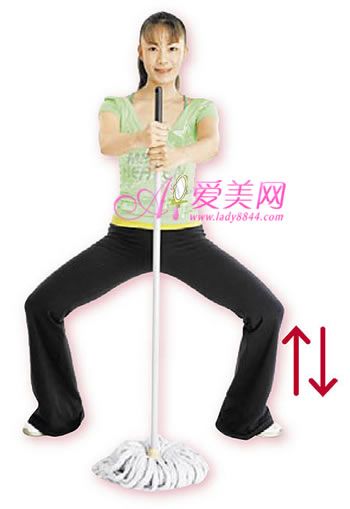 以拖把为支撑点,双腿半蹲至大腿肌肉拉紧即可,蹲下、起立各1秒钟。可重复8下为一回合,共做三回合。