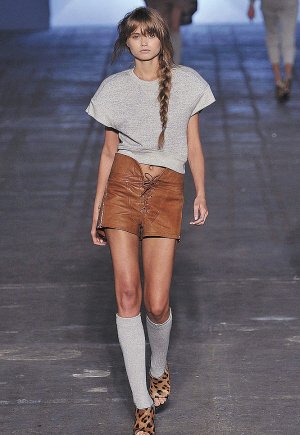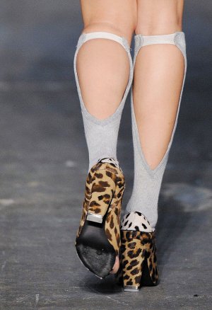 早春秀场,Gaspard Yurklevich分层式结合及膝袜和过膝袜营造叠穿感,金银丝线和纯色搭配,黑白经典,在Gaspard Yurklevich一片沙漠色的服装里透出生气来,Alexander Wang则在小腿长度的袜子上做文章,灰色纯棉质地,与热裤、短裙一同怀念曾经身着校服的学生时代,叹为观止的是,Alexander Wang把它们和露趾鞋、及踝短靴或者楔跟鞋穿着时,袜子却是背后漏风——无后背的。这些围绕膝盖上下伸缩的美妙袜子,就算外披超大款风衣,女性柔美也会呼之欲出。