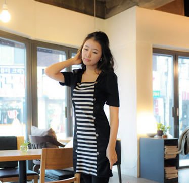 采用部分黑白条纹的设计,点缀着贝壳扣子的优雅的小黑裙,带来的腰侧的视觉收缩和正面的视觉扩张,营造完美的S身型!