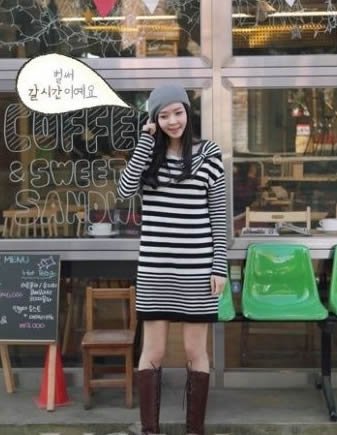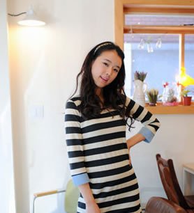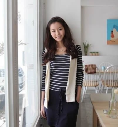 白蓝的配色条纹很常见,连身的裙子下身设计成纯色布料,演绎海军风的休闲Style。条纹上衣搭配米色开衫有魅力哦,个性的造型让你魅力大增。
