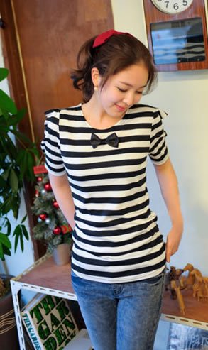 甜美的蝴蝶结点缀在简洁的黑白条纹小衫上,采用轻微的立体肩袖打破平淡剪裁。与头上的红色蝴蝶结相呼应,诠释着甜而不腻的简单look。