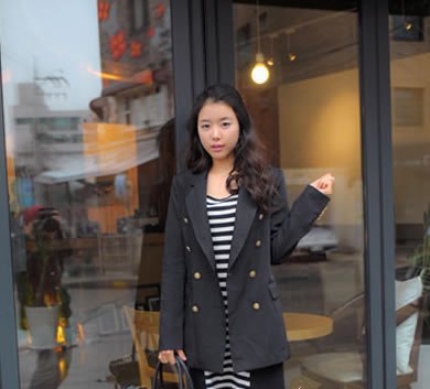 同一件黑白条纹小裙,搭配金属扣的军装外套以抵御早春的寒气,在柔美中融入些许硬朗线条!