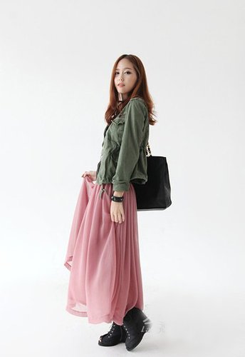 时尚搭配:军装外套+橡皮粉色飘逸长裙
