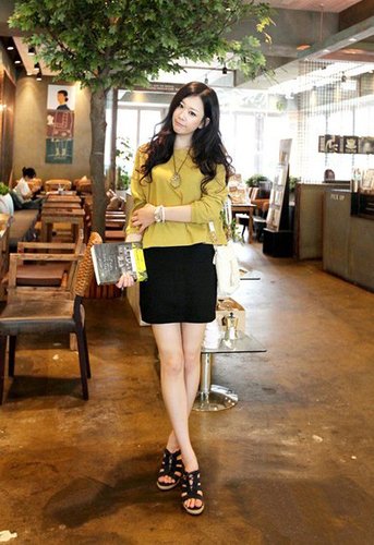 非常和风的讲黄色蝙蝠袖T恤,蝙蝠袖是身材比较胖的MM最爱,初次之外,也是潮人造型的必备单品之一,搭配较为正式的半身短裙,就可以穿去上班囖!