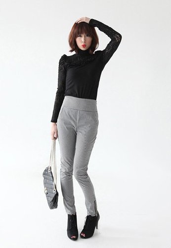 千鸟格系列是职场MM的最爱,因为千鸟格元素无论搭配任何时尚单品都能搭出职场的高档时尚,就像这样简单搭配一件黑色蕾丝拼接高领针织衫,便气场无限。