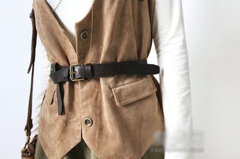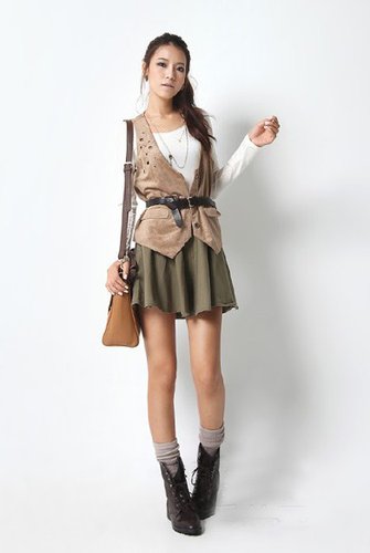 时尚搭配:白色T恤+棕色麂皮马甲+墨绿色毛边短裙