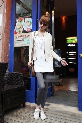 时尚搭配:米色连衣裙+香槟金色外套+灰色打底裤