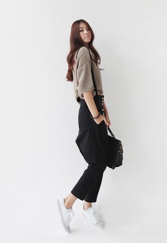 时尚搭配:蝙蝠袖毛线衫+黑色背带裤