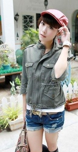 立领肩章带收腰的小外套搭配做旧的破洞牛仔短裤,随意的穿着也能搭配出令人意想不到的效果。
