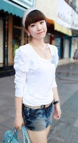 很有学生味的一款泡泡袖T恤噢,搭配亮片的牛仔超短裙,一样很有吸引力哦。