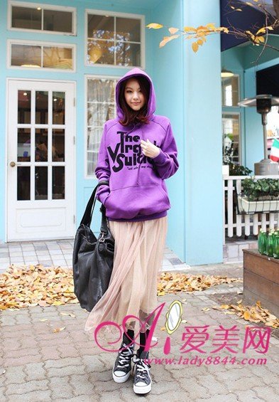 来到冬日,才发觉卫衣和长裙是如此的合拍,选择诱惑人心的魅惑紫色,搭配粉嫩的浅粉色纱纱长裙,运动风和仙女魅力的对决,反而碰撞出一个完美的效果。