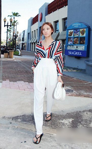 纯净的白色高腰阔腿裤,优雅利落,将彩色条纹雪纺衫束进腰间,塑造出的线条有强烈的时尚感,既不是过分的温柔小女人味,也不是夸张的强势大女人风,把女人的优雅和温柔,帅气和知性完美结合。