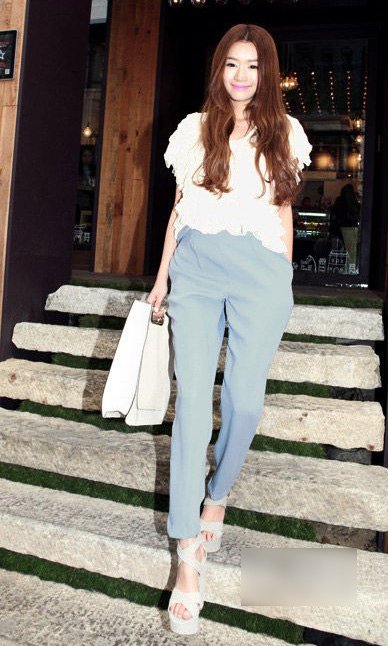 清新的粉蓝色阔腿裤,质地清凉舒适,搭配充满设计感的白色蕾丝上衣,层层叠叠的设计十分精致优雅,加上一双厚底凉鞋,拉长腿部线条,展现修长双腿。