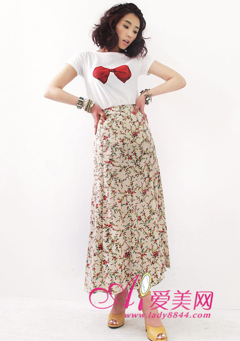 打造九头身黄金比例,那么短小的T恤和及踝长度的长裙是最佳拍档!上身一件蝴蝶结图案的白色T恤简约大气,下身一条充满夏日风情的碎花长裙飘仙唯美。