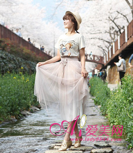 粉色是每个女生都无法拒绝的颜色,网纱材质更突显甜美气息。搭配俏皮可爱的卡通图案T恤,非常有度假的感觉哦!