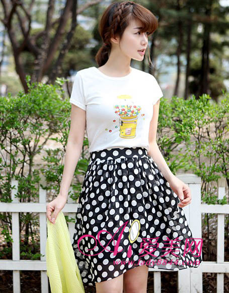 可爱的波点向来受宠,而这条白色波点黑色底的中裙更是百分百吸睛,轻盈飘逸的不规则裙摆很甜美,搭配可爱又修身的T恤,瞬间打造完美身材。