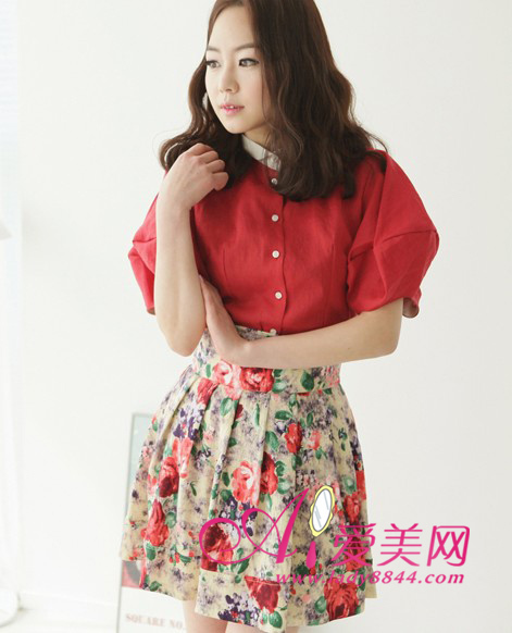 泡泡袖的红色上衣有着复古的宫廷风气息,搭配一条蓬松度恰倒好处的印花高腰裙,整体造型高雅不失甜美。