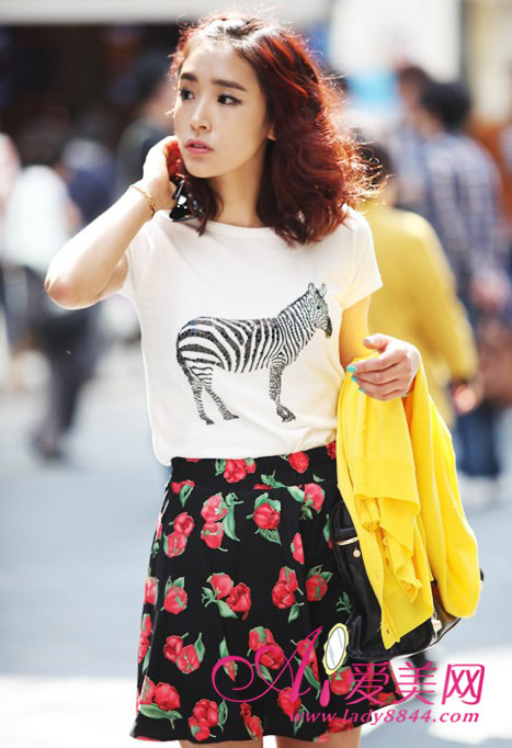 简单明了的白色T恤在休闲装中可是长久不衰,下装搭配一条印满红色玫瑰花图案的黑色短裙,鲜明的黑白搭配,让你看上去格外神清气爽。