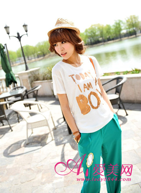 金色字母短袖T恤,搭配荧光色休闲长裤,休闲中透着一丝帅气甜美感。