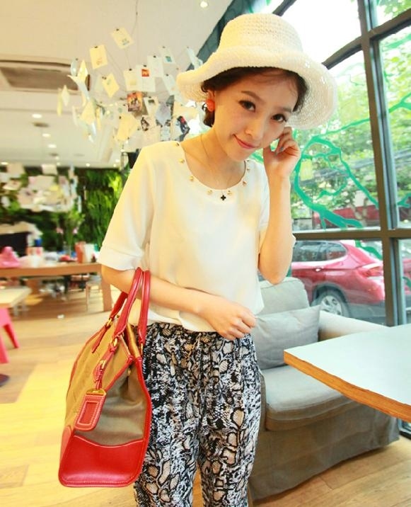 独具匠心的设计,领口的铆钉设计,立体感十足,雪纺材质,透气亲肤,很适合夏天选购的一款雪纺衫哦