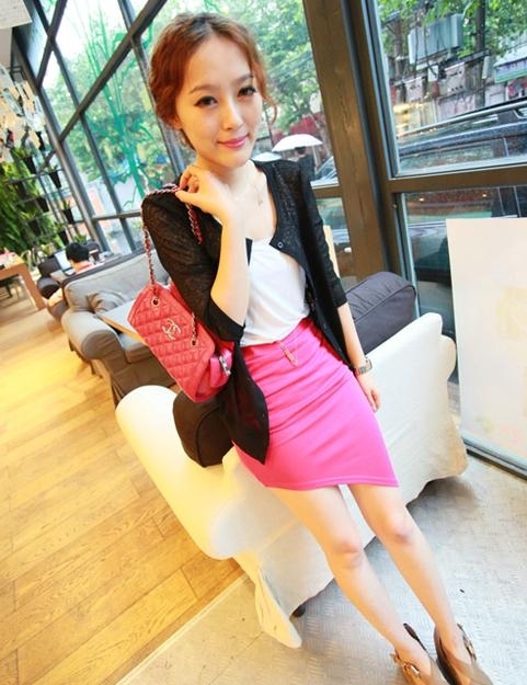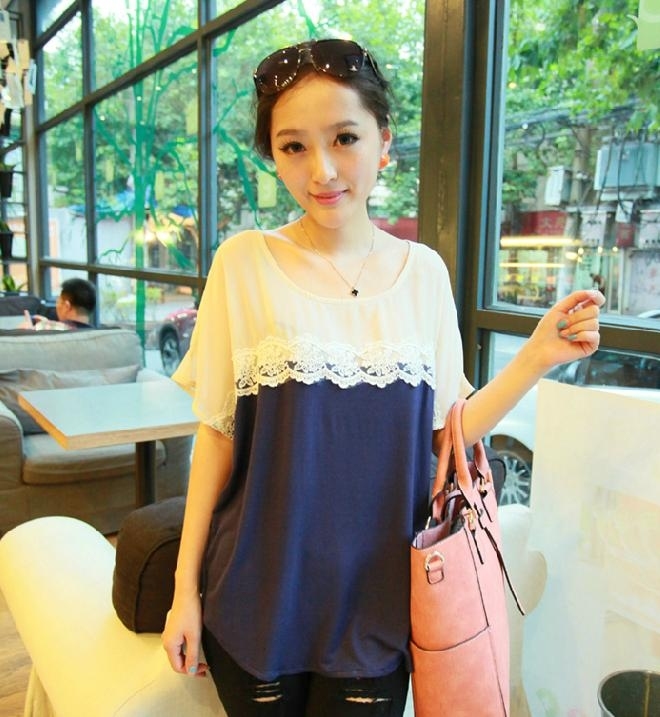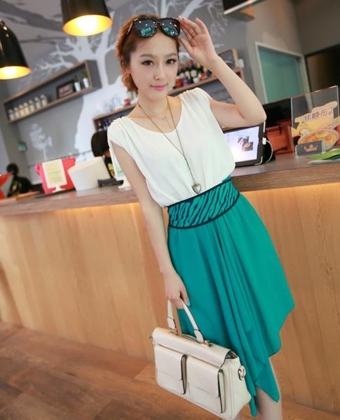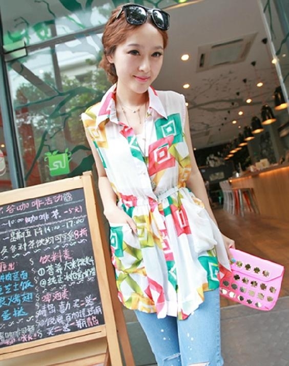 优雅别致的白色长上衣,绿色跟蓝色的不规则下摆,灵动飘逸。今年亮色一直是MM们的大爱,本款设计风格简约时尚