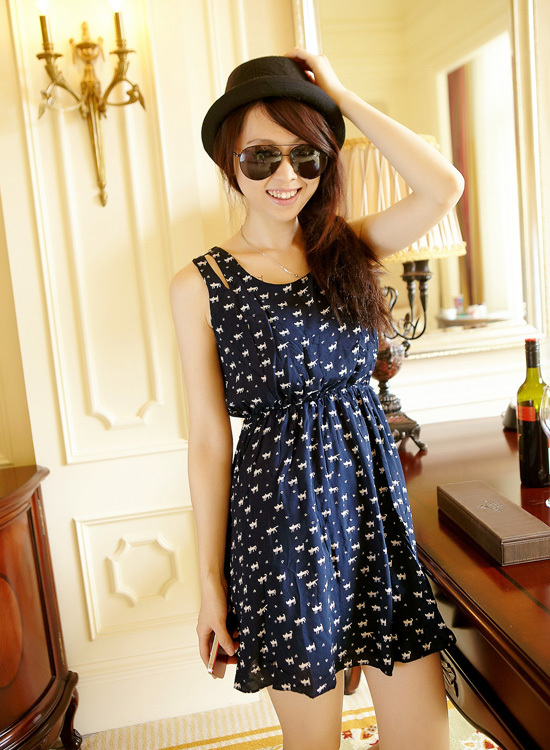 甜美猫咪印花雪纺连衣裙,飘逸,动人