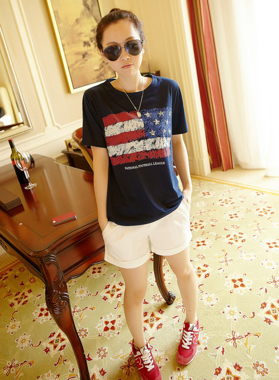 做旧国旗印花Tshirt,柔软舒适的面料,下身随意搭配休闲短裤就能尽显随性气质
