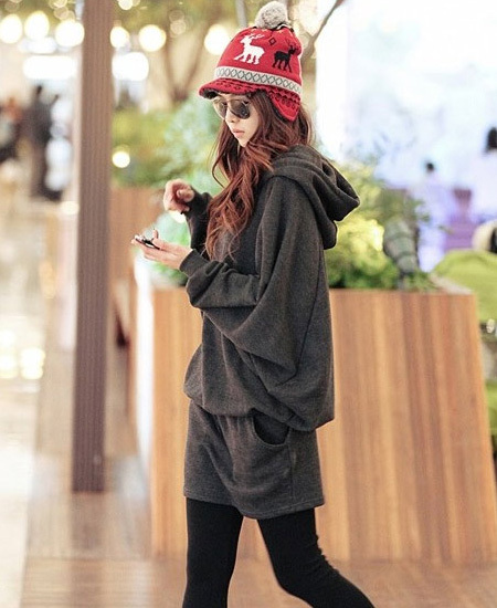 上身蝙蝠袖 连帽 拉链开襟 字母装饰,下身收身短裙,秋季气质修身款。并使用简单、轻质、柔软的优质毛圈面料,舒适贴身。颜色有黑色 灰色 主流百搭色,在这一季搭配长靴 马丁靴 帅气时尚气质。
