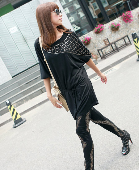 T恤属于宽松款,面料柔软舒适,亲肤性好。整体版型很有欧美风的感觉,不对称的肩部铆钉设计,时尚个性。由于是长款的,如果亲们喜欢的话可以像模特那样里面搭个黑色裤袜,做连衣裙穿,天凉的时候搭配靴子,风衣外套,绝对有型有款,很出位哦~~