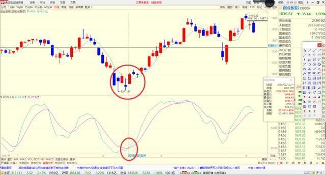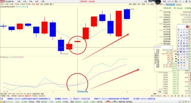短线方法,以创业板指数周线KD指标金叉,日线为多方喜欢架构举例。2018年2月23周线级别KD指标金叉。