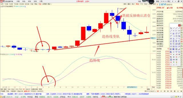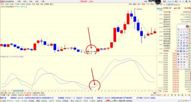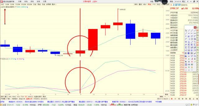 以上证50指数为案例分析,2014年9月季线级别KD指标金叉,月线为多方循环架构。