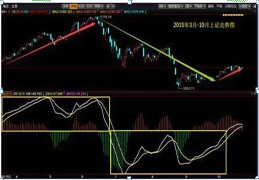 MACD顶背离有两个判断条件,股价攀升,黄白线死叉呈现向下趋势;股价上升,MACD红柱区域面积却在缩小。参考下图: