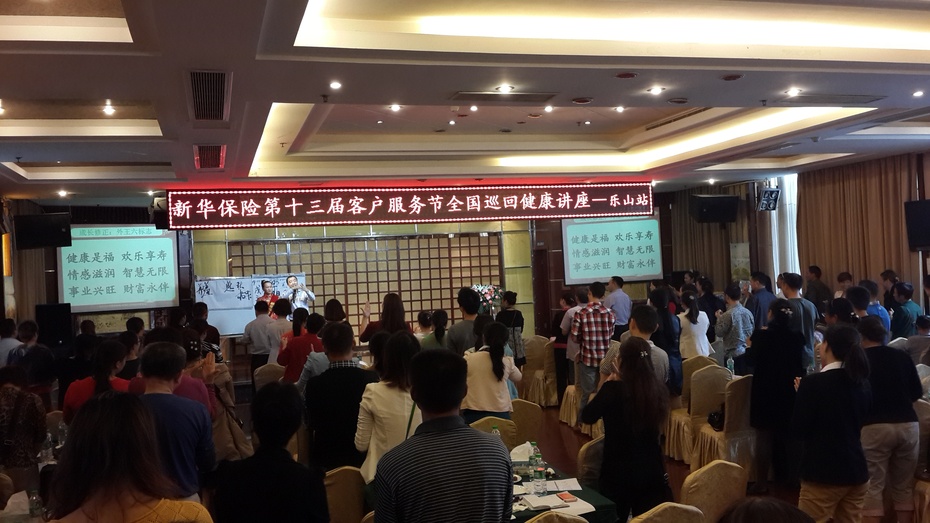 下午,“新华保险第十三届客户服务节全国巡回(乐山站)健康讲座”在天尊大酒店11楼大会议室隆重举行,孙光夫带来了一堂题为《人不养生,天地不饶》的饮食营养与养生讲座,来自乐山的新华寿险新老客户100余人济济一堂,欢乐聆听。