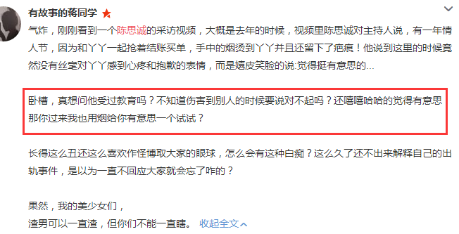 看看下面这位网友评价陈思诚的,说的很实在,很准确:卧槽,真想问他受过教育吗?不知道伤害到别人的时候要说对不起吗?还嘻嘻哈哈的觉得有意思,那你过来我也用烟给你有意思一个试试?http://si1.go2yd.com/get-image/0AIPBy4RLAO