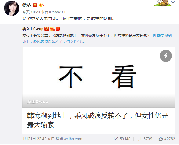 这两天韩寒开始疯狂地宣传新片,至于新片名字就不想说了,没兴趣。愚公愚乐感兴趣的是,女星徐娇在网上公开怒斥韩寒,因为韩寒不尊重女性。她转发了一篇文章,该文章对韩寒“消费女性”和“借助女权主义反转营销”的方式做了批判。