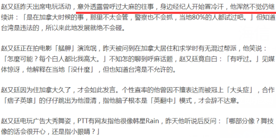 爆料帖子的原话是:赵又廷出席电玩活动,意外透露曾呼过大麻的往事,身边经纪人开始冒冷汗,他浑然不觉仍继续讲:是在加拿大时候的事,那里不太会管,警察也不会抓,当地80%的人都试过吧。但知道台湾是违法的,所以来此地发展就绝不会碰。http://si1.go2yd.com/get-image/0BOjOEQJXkG