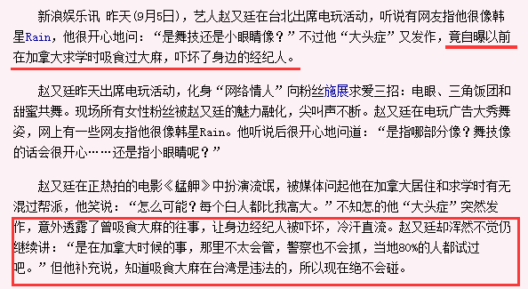 笔者以为这是一个道听途说的八卦消息,可是当笔者继续挖掘相关新闻时,却在某著名门户网站上看到了下面这个标题,当场把我吓尿了。原来是赵又廷2009年时自己爆料说曾经在国外吸食大麻,这是真事!http://si1.go2yd.com/get-image/0BOjOEZyVPc