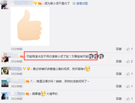 不过,也有网友猜测说:上王牌的时候说关于爱情公寓的延续会努力的,然后现在又说拍5是假消息,评论里自己说会有惊喜,估计是不一样的形式再聚首,感觉是电影之类的。http://si1.go2yd.com/get-image/0C0DzKlSS9I