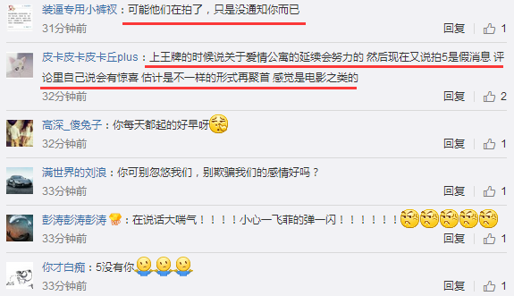 网友也是很无奈地说:可能他们在拍了,只是没通知你而已;你可别忽悠我们,别欺骗我们的感情好吗?卧槽,不你自己说的吗?你还说保证;原来是假的啊,白高兴一场;出尔反尔,男人的嘴巴就是这么满嘴谎话?